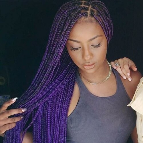 These gorgeous waist-length box braids are perfect if you prefer a deeper shade of purple. Pair them with a matching shade of lipstick for an even bolder look.