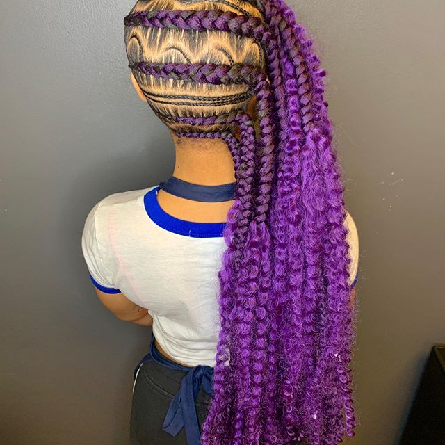 This is a truly unique way to wear purple braids. Purple braiding hair in the front paired with black braiding hair in the back creates an interesting look, especially when pulled up into a high bun, which is a great way to show off a shaved design in the very back of the head like this one. Make sure to take you time when doing your zig-zag designs.